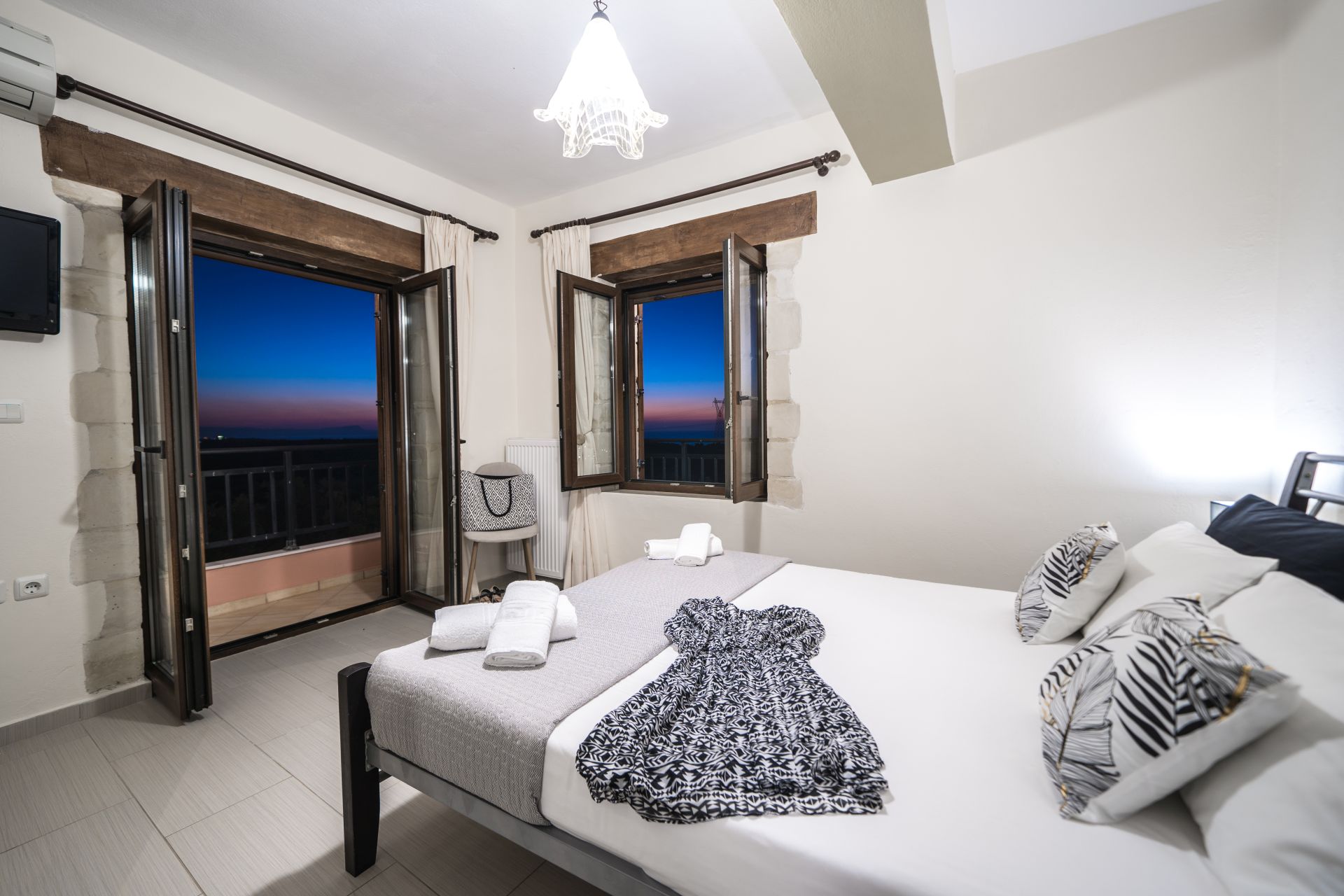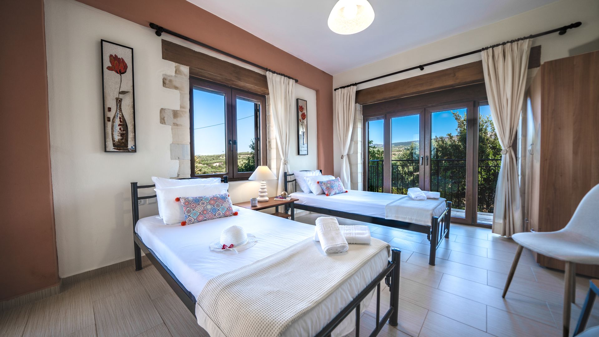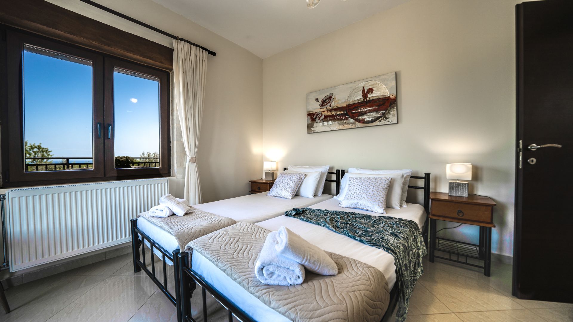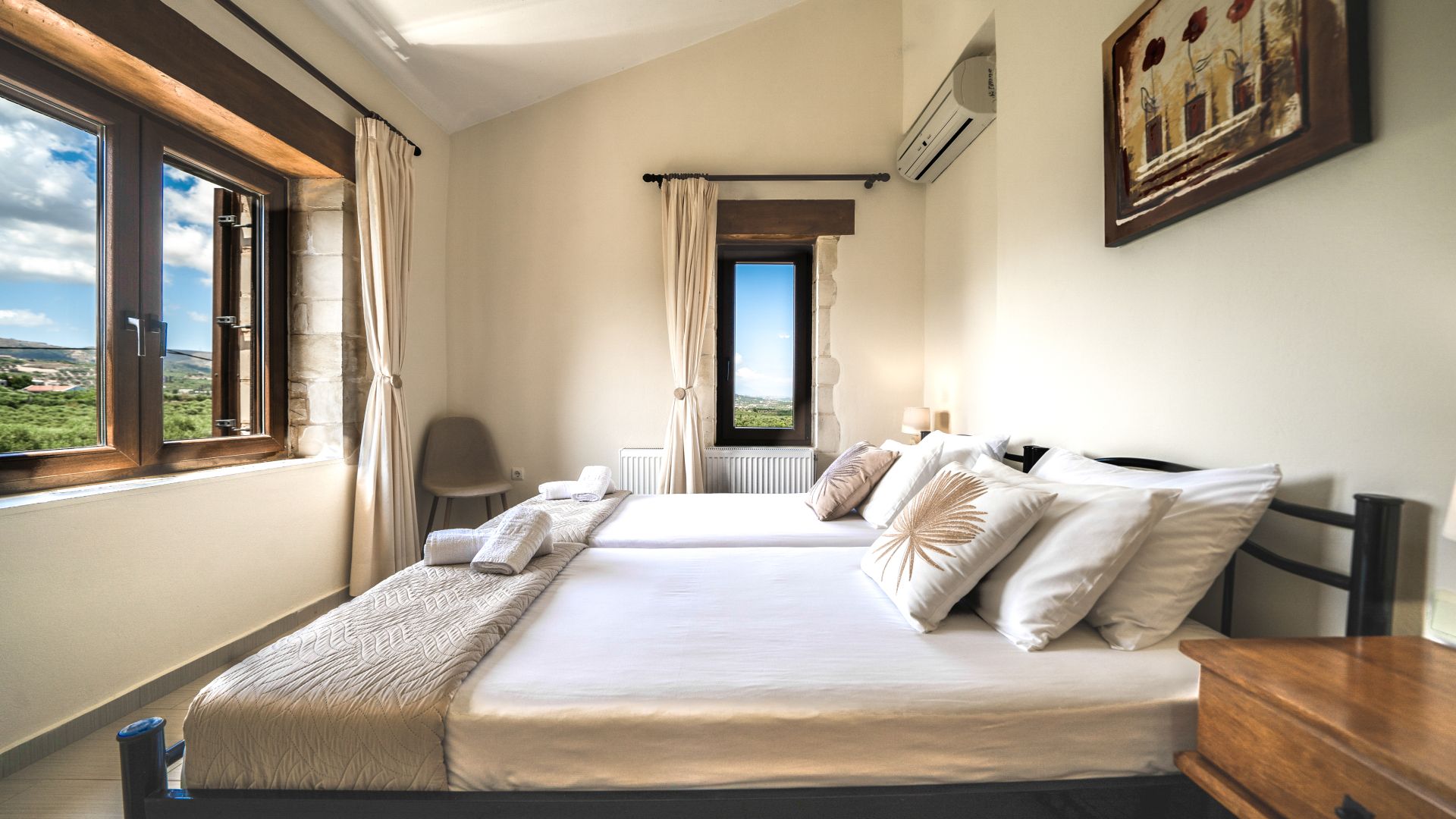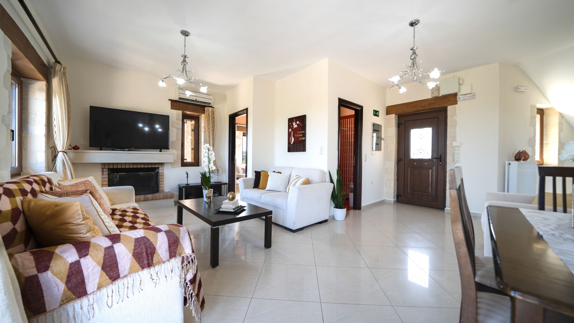 Villa 1 consists comfortable spaces inside, four double bedrooms, living room, dining room, traditional fireplace, two bathrooms, fully equipped kitchen, semi-outdoor area and very large terraces. All rooms have panoramic and unobstructed view of the unique Cretan landscape.