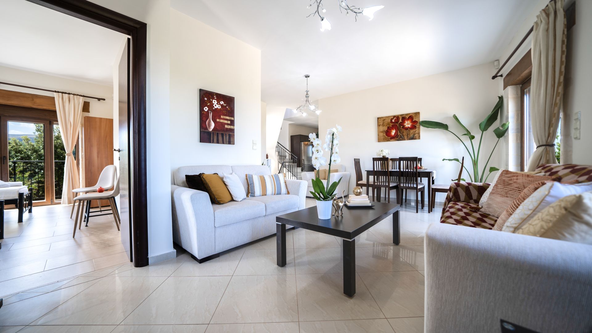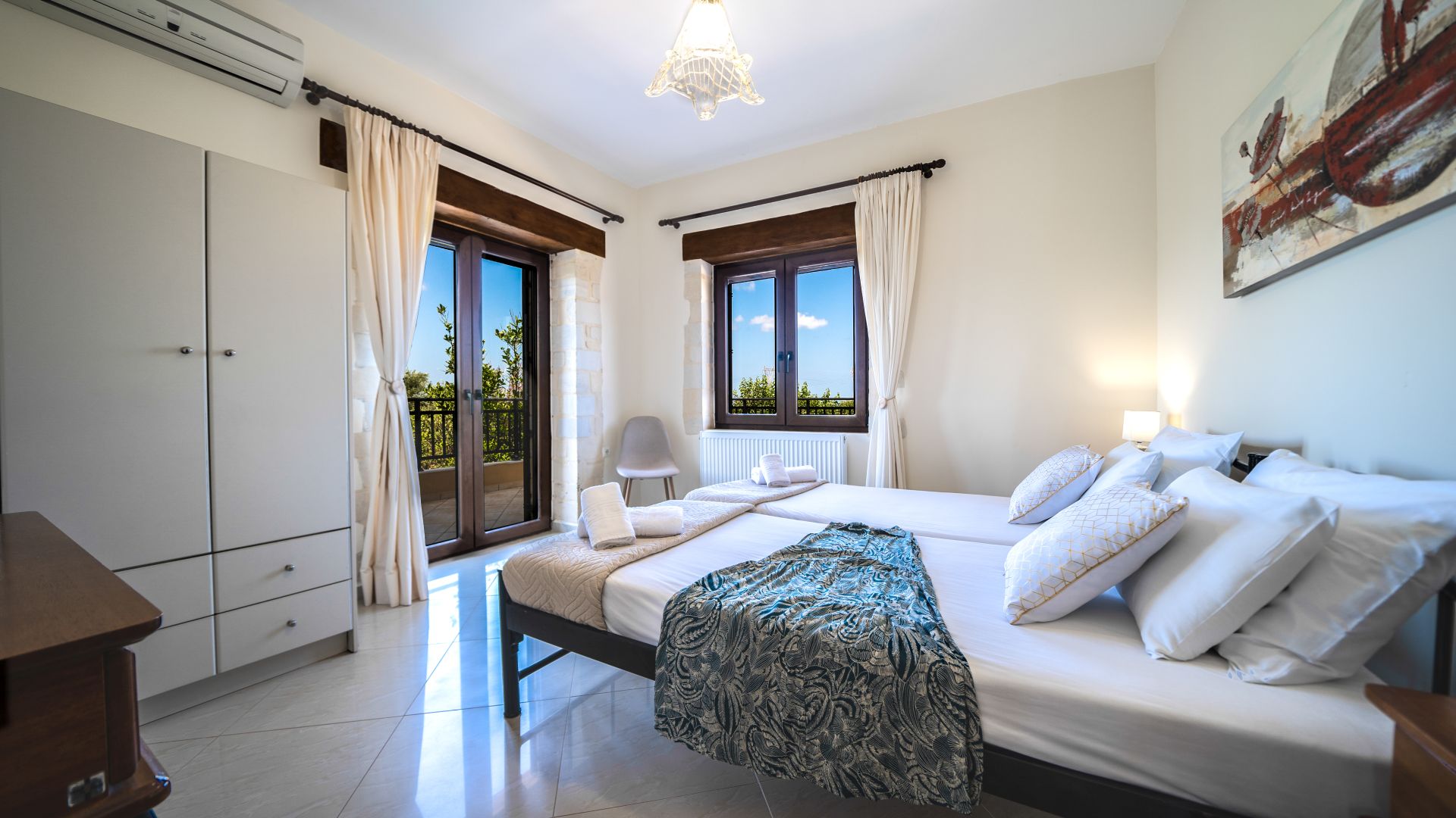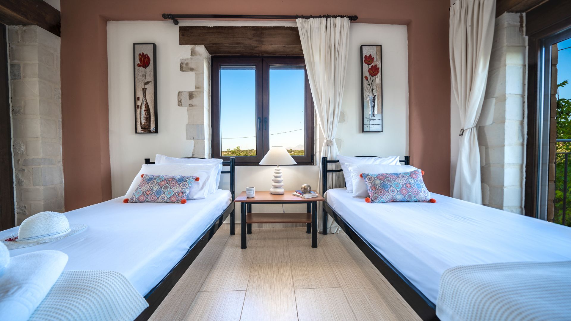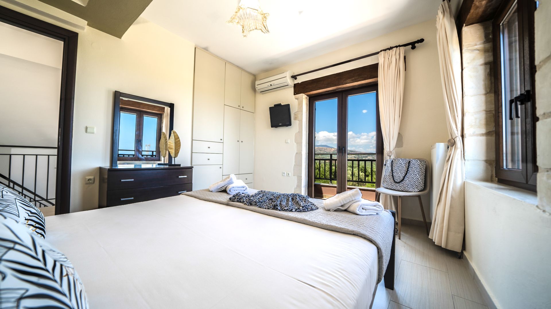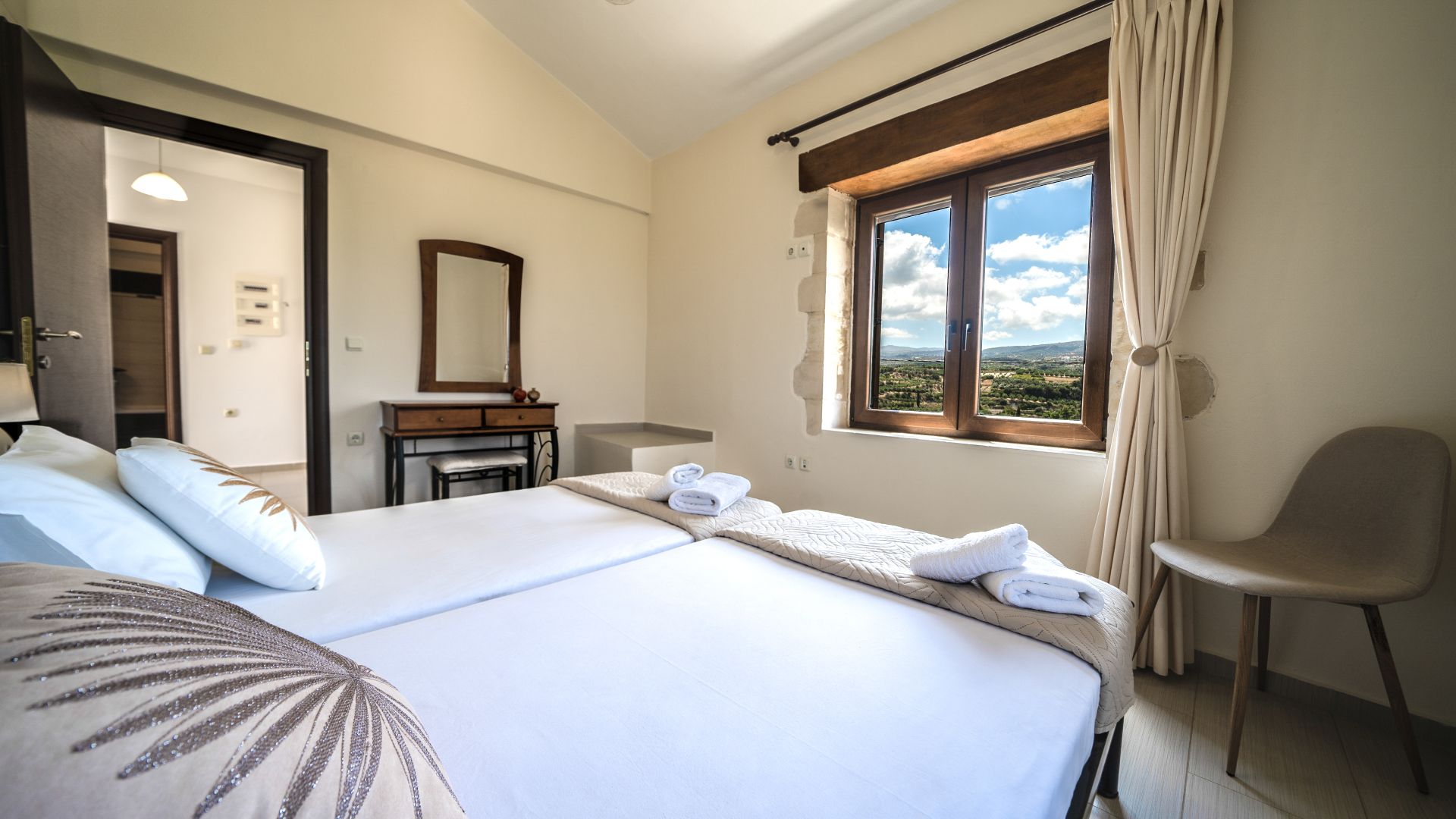 Villa 1 consists comfortable spaces inside, four double bedrooms, living room, dining room, traditional fireplace, two bathrooms, fully equipped kitchen, semi-outdoor area and very large terraces. All rooms have panoramic and unobstructed view of the unique Cretan landscape.